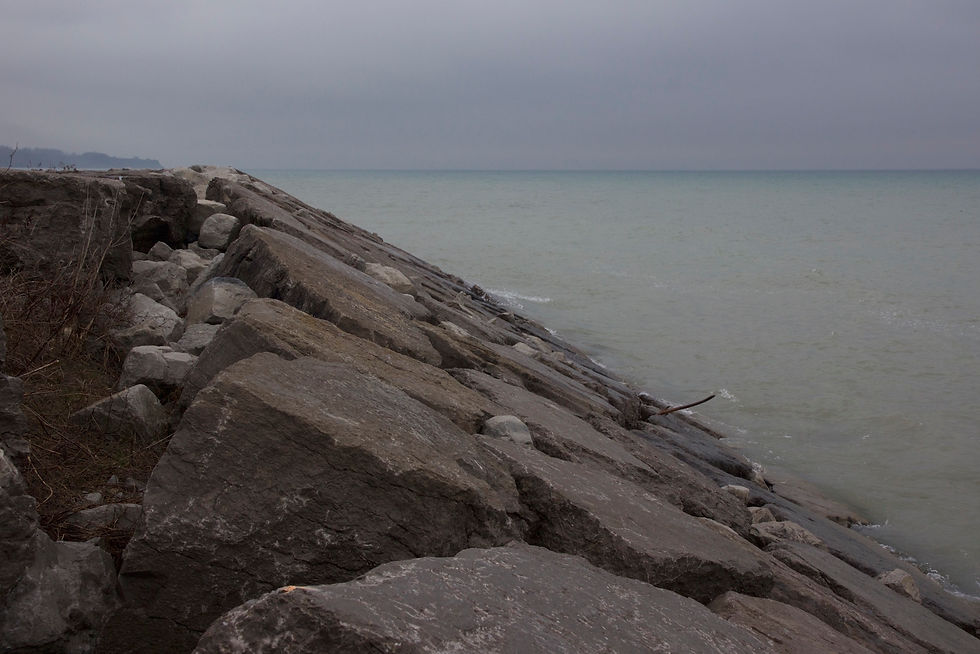 Below on the left, is an image of Lake Ontario's shoreline adjacent to Guildwood Park. It demonstrates how the natural transition from land to water is completely obliterated. The waters edge is hardened with armour rocks. It creates a solid barrier preventing access to the water.